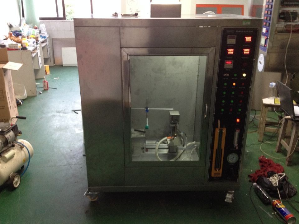 The tester uses two specimen shapes: long rectangular bars for assessing burning characteristics, and square plates for penetration resistance. It features a 500W burner with adjustable flame dimensions (125mm outer, 40mm inner), a 0.75m³ enclosed black test chamber, a 20° combustion angle, and a 0-99.9s adjustable timer, ensuring accurate and repeatable test results.